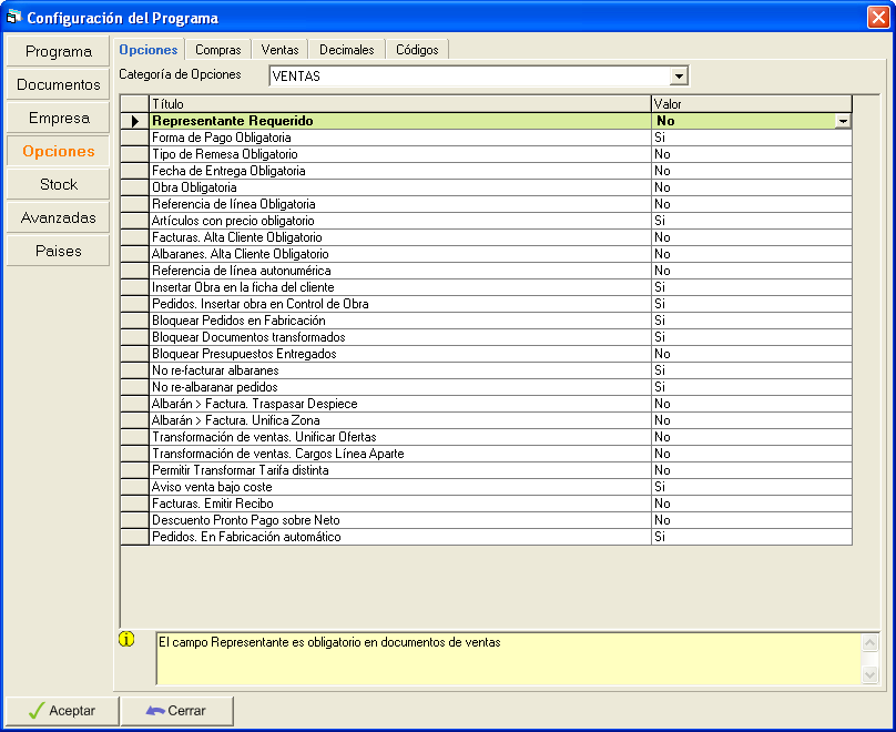 Las 3 primeras secciones, Programa, Documentos, Empresa dan acceso a las configuraciones más comunes y básicas de la aplicación.