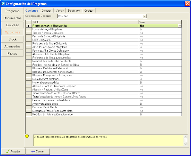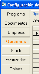 - Selecciona la categoría deseada en la lista desplegable Categoría de Opciones y en la rejilla situada en la parte inferior aparecerán las opciones pertenecientes a dicha categoría